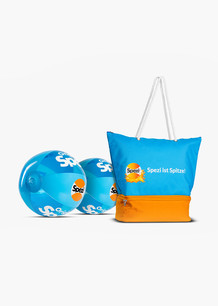 Noch ein Schluck Spezi und schon steht's 1:0 für Dich beim Spezi-Wasserball-Match. Der Ball (Durchmesser ca. 40cm) aus transparentem PVC hat Einsätze in durchsichtig und blau mit schwarzer Beschriftung 'Da ist Saft drin'. Der Clou: Im Inneren des Wasserballes befindet sich das Spezi-Logo 3D. ebenfalls aus PVC.