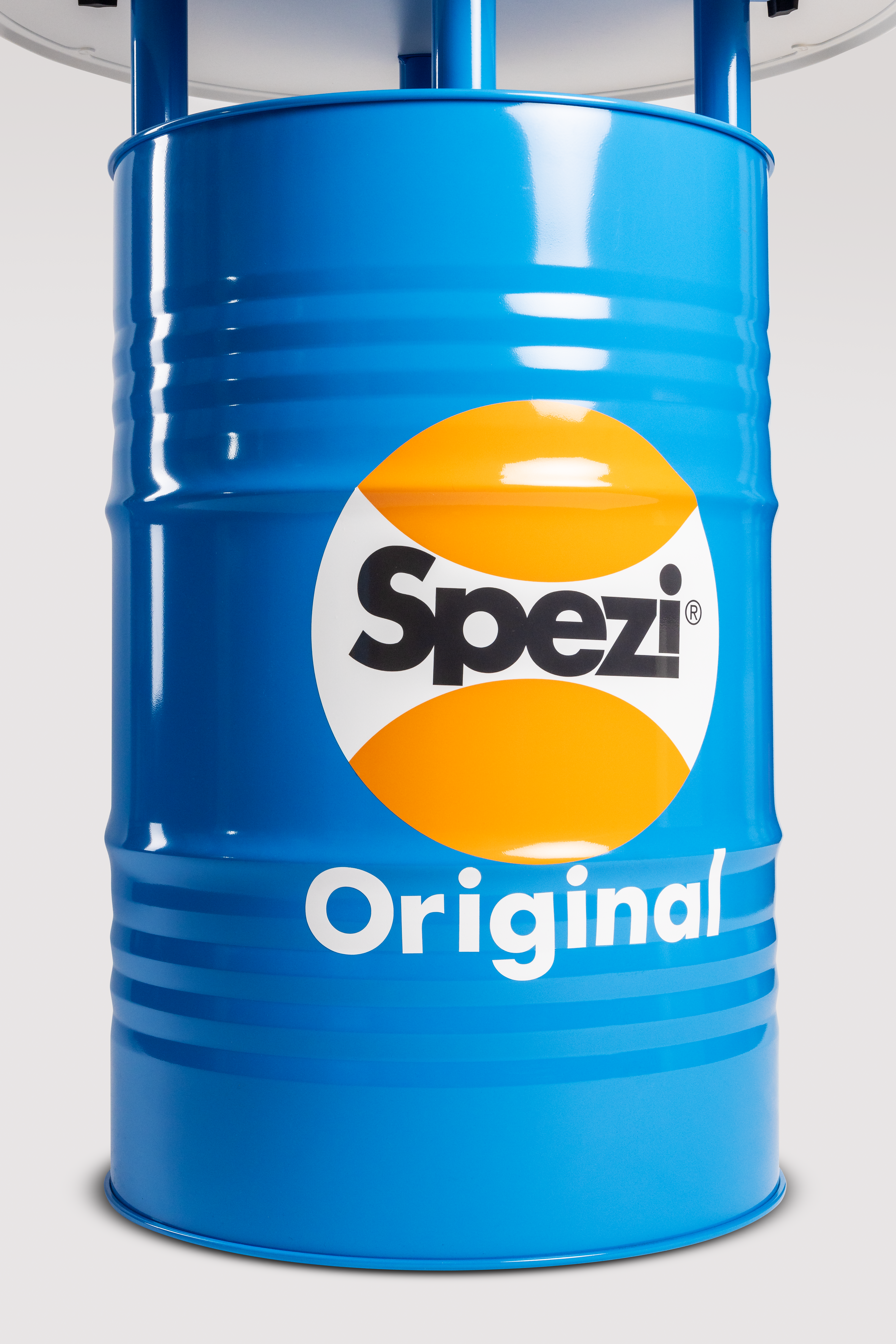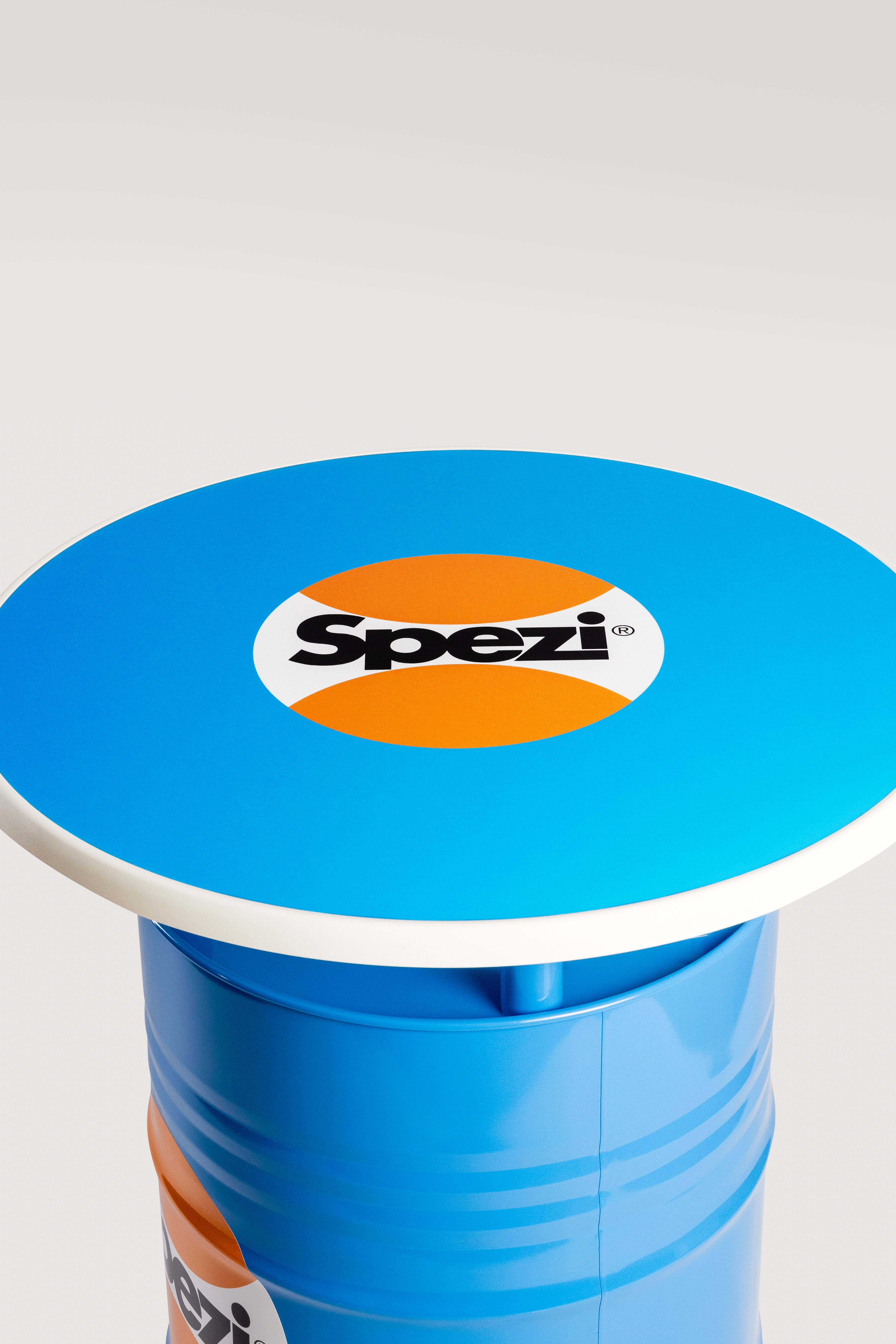 Tischplatte: weiß, mit Druck vom Spezi-Logo