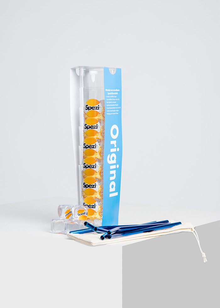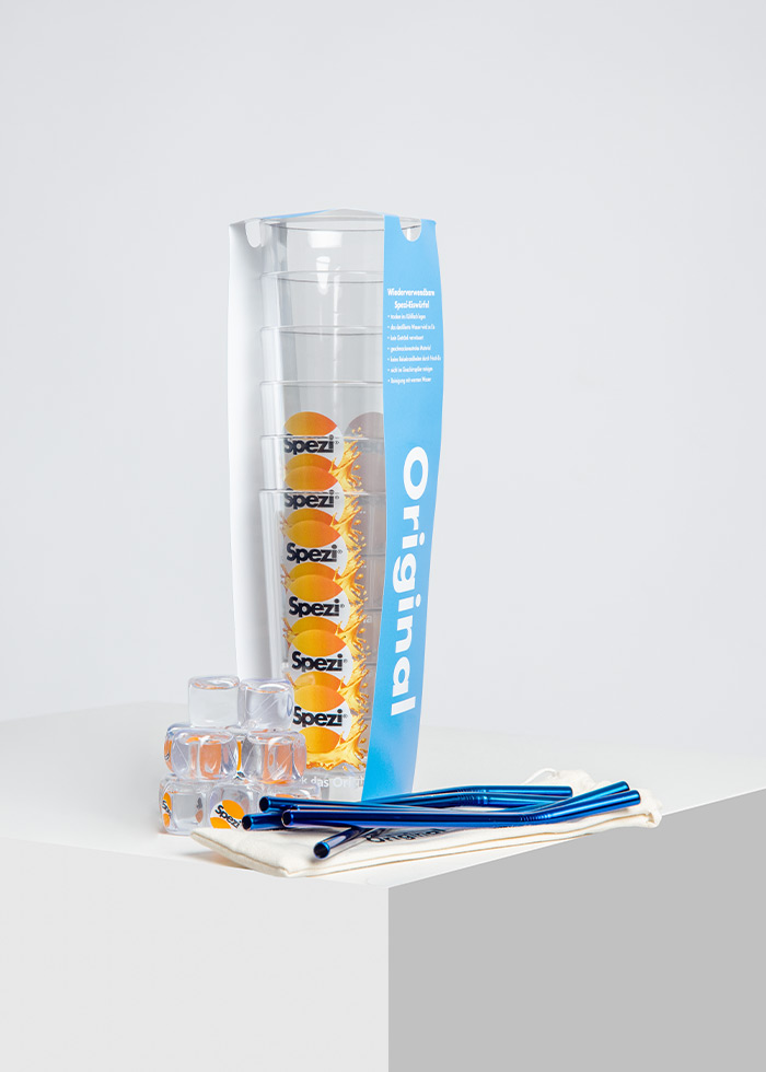 Das Spezi Mehrwegbecher-Set kommt mit sechs robusten Bechern aus Plastik im Spezi Design sowie, sechs wieder verwendbaren LOGO-EISWÜRFEL FREEZE ME®, die Ihr Spezi kühlen aber den Geschmack nicht verändern und verwässern. Zudem erhalten Sie sechs Metall Trinkhalme mit Reinigungsbürste kompakt verpackt in einem Leinensäckchen.