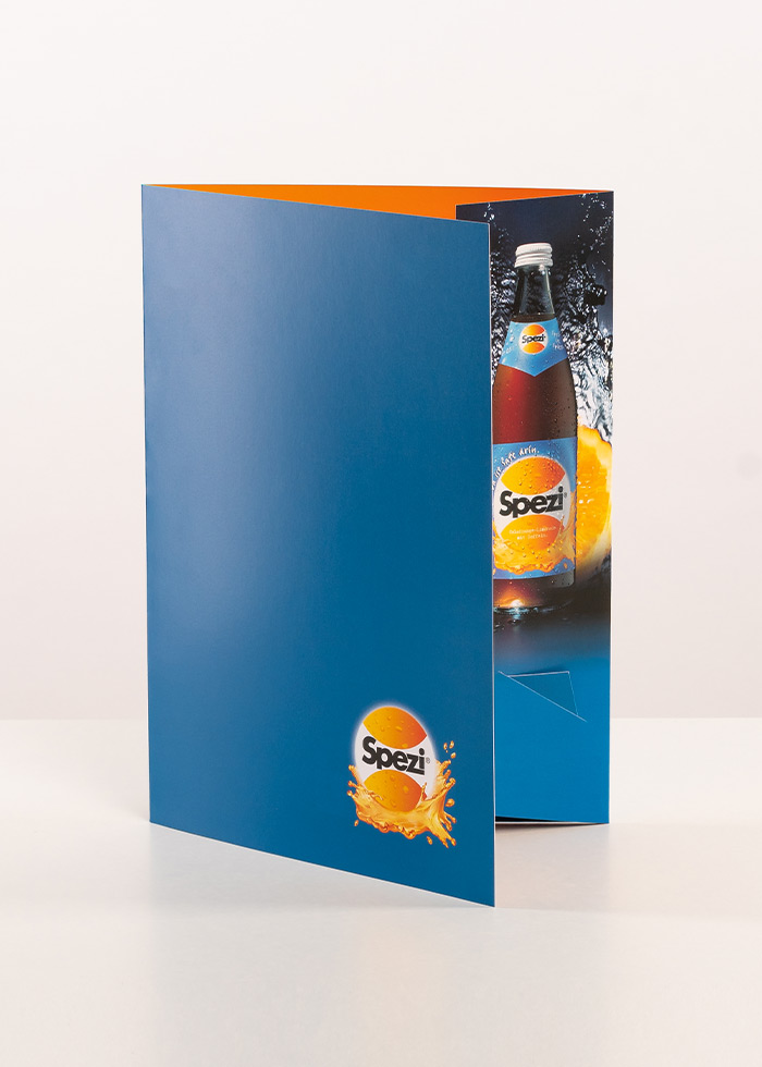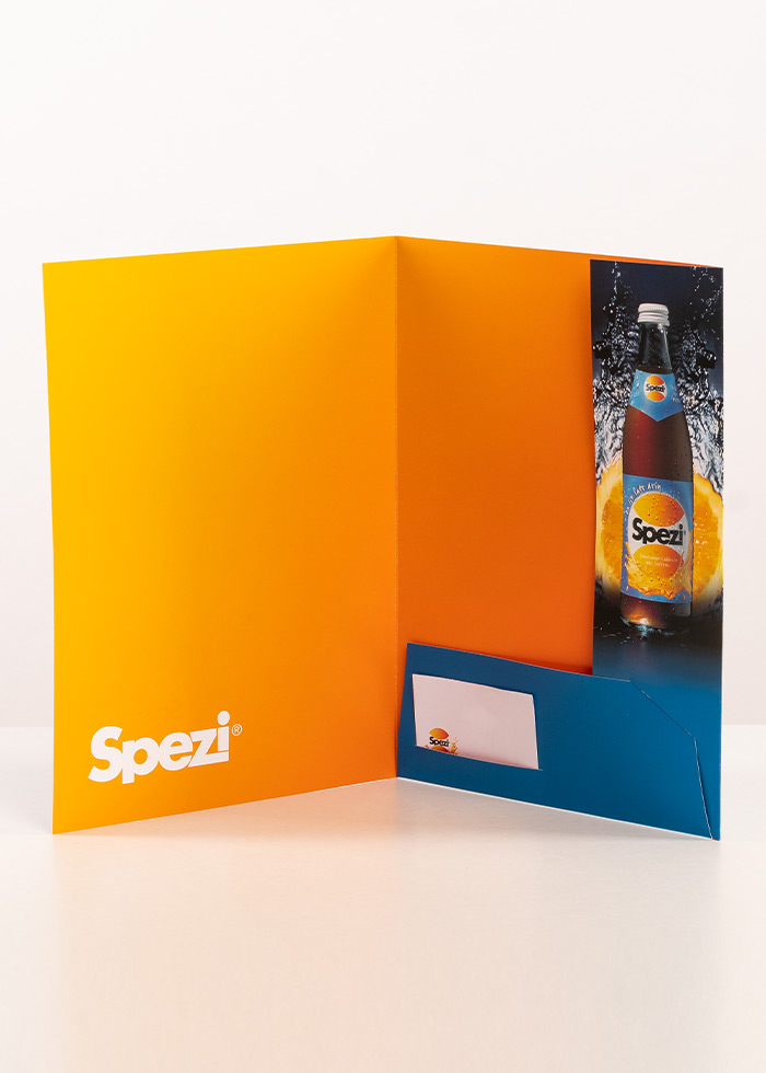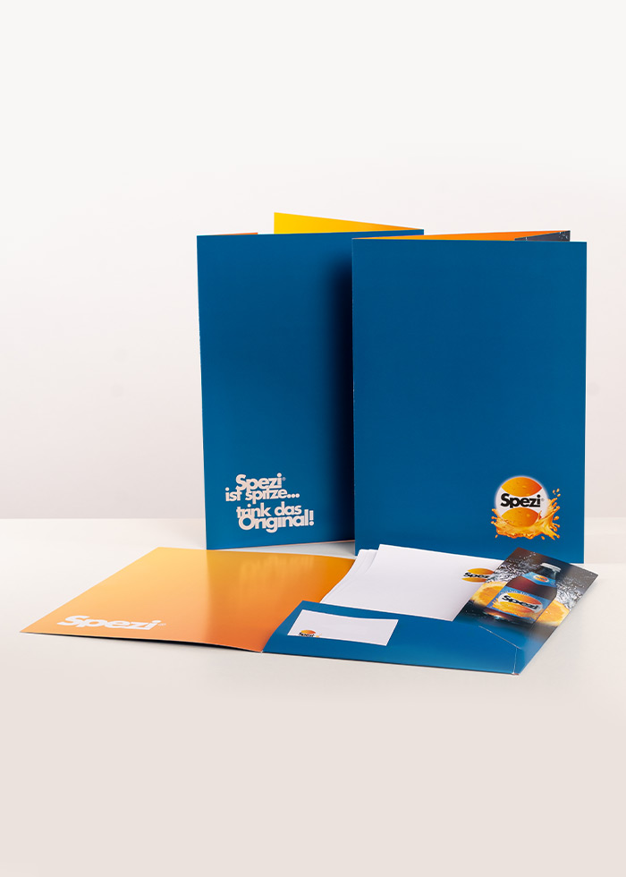 Mappen im Spezi e:nergy Design4c Offsetdruck – Vorderseite schwarz- und Innenseite Farbverlauf orange-rot - vielseitig einsetzbar.Innen mit Visitenkartenschlitz.Material:400 g PapierFormat:22 cm x 30,5 cm geschlossen52 cm x 38,5 cm offen