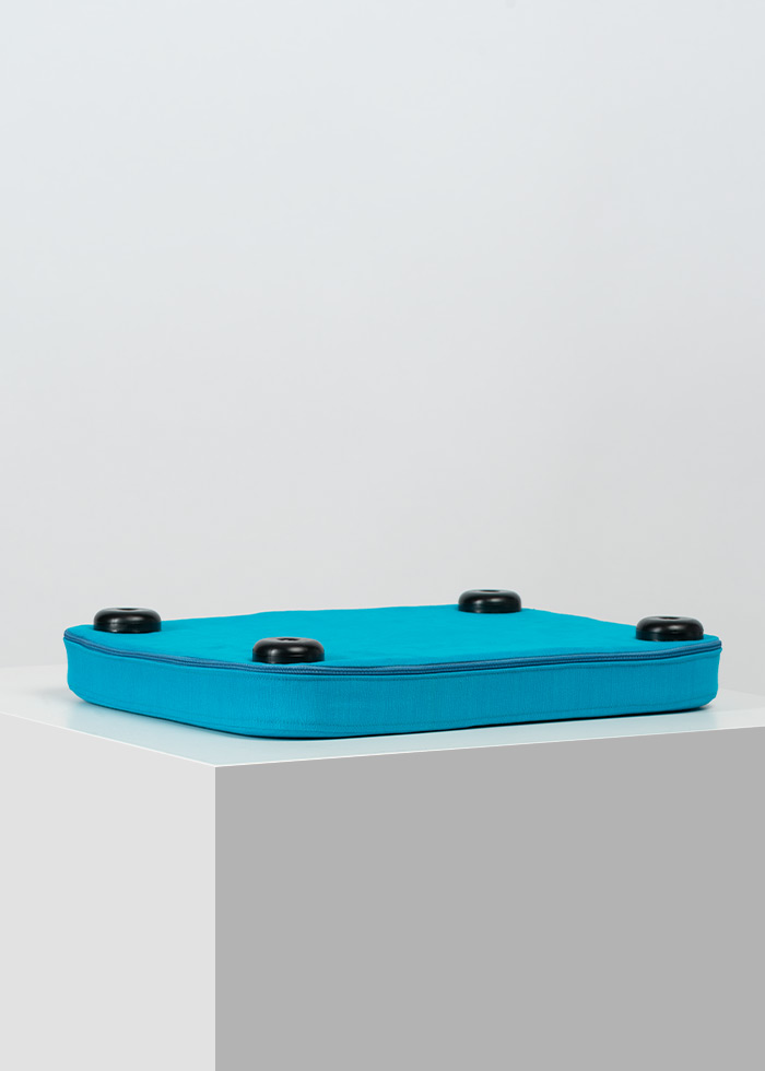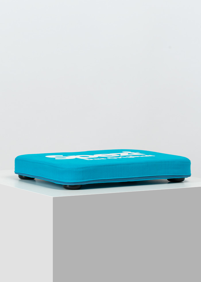 SitzelementForm: rund Höhe: 42 cm x 41 cm Durchmesser Stoff: 100% Polyester, 280g, M2, mit PU Beschichtung an der Innenseite, wind- und wasserdicht, mit B1 und Öko-Tex Zertifikaten, Lichtechtheit Grad 7 Druck: oben und unten 4C (Logo), seitlich (blau) Füllung: Korpus aus Styropor (PS) mit 5 cm Schaumstoff an der Oberseite und 150g M2 Polyesterwatte an den Seiten