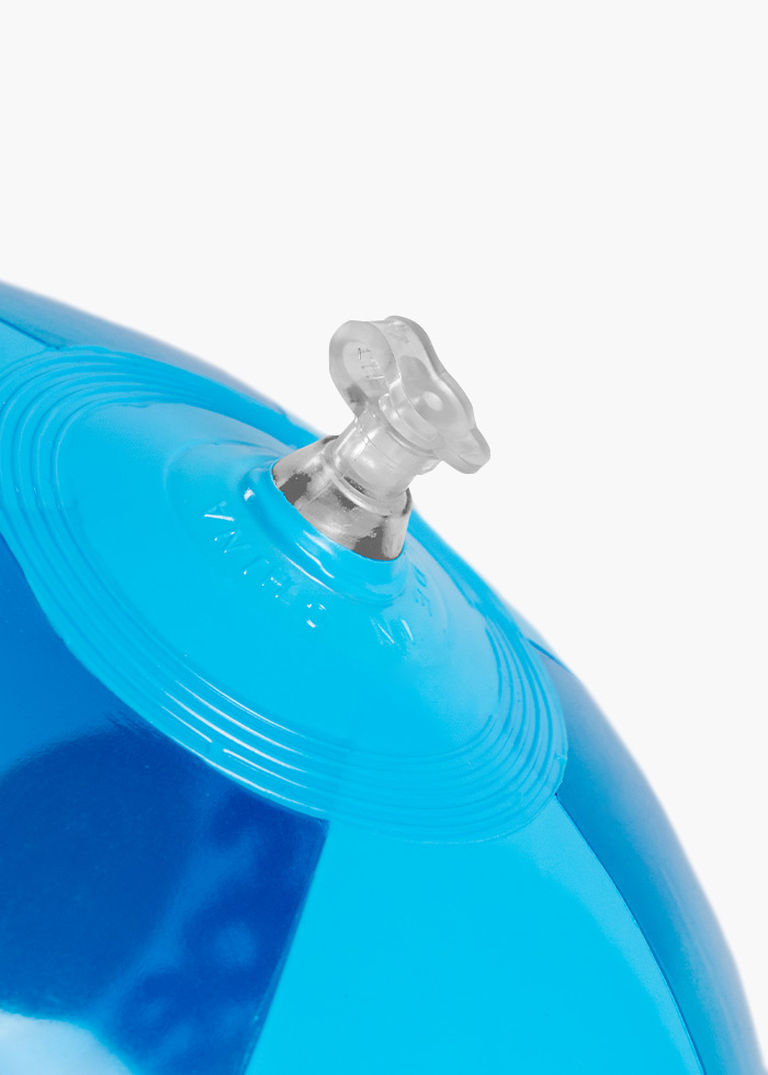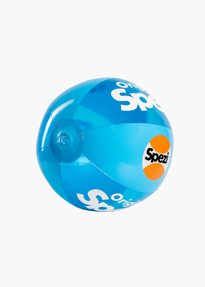 Der Ball (Durchmesser ca. 28 cm) aus transparentem PVC hat durchsichtige und blaue Einsätze mit weißer Beschriftung "Original SPEZI" und unserem Spezi Logo.