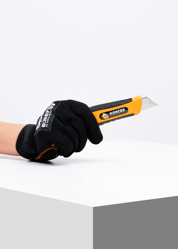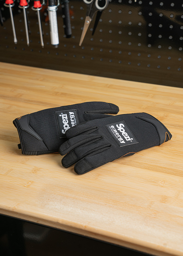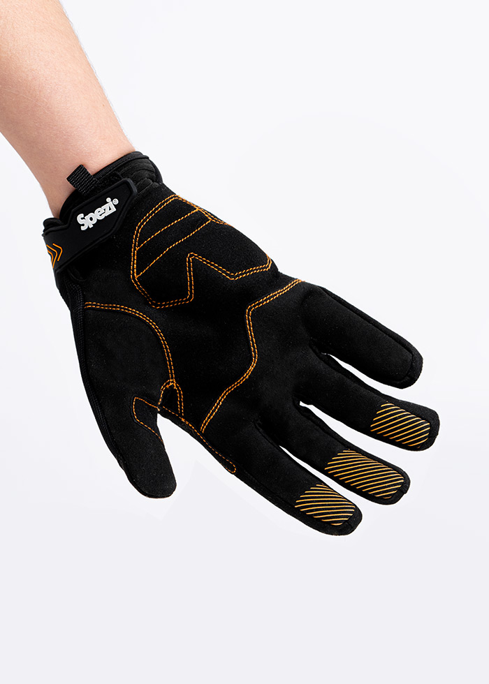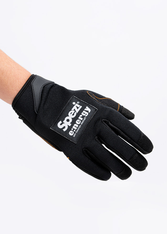 Neopren-Obermaterial, Innenhandflächen und Fingerspitzen, Daumen und Zeigefinger aus Kunstleder verstärkt. Ringfinger und Zeigefinger mit Gummiapplikation ermöglicht Touchscreen-Anwendungen. Einfaches Aus- und Anziehen durch flexiblen Klettverschluss am Handgelenk. Nähte und Applikationen in Spezi-Orange , wind- und wasserabweisend.