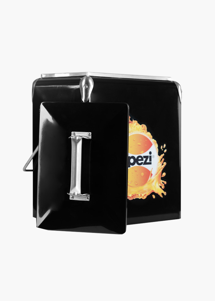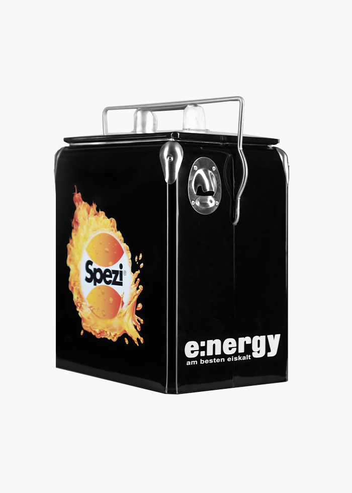 Produktinformationen "Spezi Original Retro-Cooler" Gehäuse in blau eingefärbt, weißer Schriftzug, retro Spezi-Logo Material: außen Metall, innen Aluminium Ausstattung: inklusive Flaschenöffner außen Volumen: 17 l Abmessungen: 32 x 23,5 x 36 cm entspricht der EU-Lebensmittelverordnung
